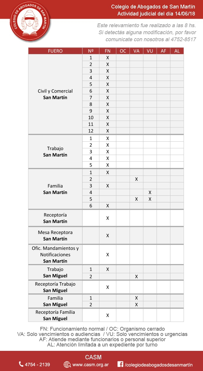 Informamos que todos los organismos y dependencias del Departamento Judicial San Martín funcionan con normalidad a excepción del Tribunal de Trabajo Nº2 de San Miguel, que sólo atenderá vencimientos y audiencias.