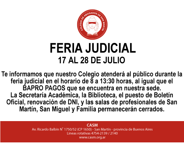 Anunciamos que durante la Feria Judicial de Invierno la Secretaría Académica del Colegio permanecerá cerrada.
