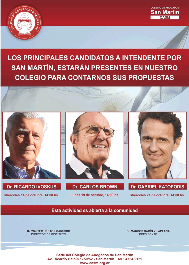 Ricardo Ivoskus, Carlos Brown y Gabriel Katopodis confirmaron su presencia en el Colegio de Abogados de San Martín para exponer sus propuestas. El Colegio de Abogados de San Martin recibirá al Dr. Ivoskus (Cambiemos) el 14 de octubre, al Dr. Brown (Frente Renovador) el 19 de octubre y al actual Intendente, Dr. Katopodis (Frente para la Victoria) el 21 de octubre, quienes anticiparán sus proyectos políticos para las elecciones generales del próximo 25 de octubre. Los tres encuentros organizados por el Instituto de Derecho Político a cargo del Dr. Walter Carusso, se realizarán todos a las 14 hs. en la sede del CASM. El presidente del Colegio de Abogados, Dr. Marcos Dario Vilaplana, estará a cargo de la apertura de cada uno de los eventos que tienen como fin que los candidatos puedan exponer sus propuestas para el Municipio. Las autoridades del Colegio de Abogados de San Martin, ubicado en la Av. 101 (ex Ricardo Balbín) Nº 1750, San Martín, informaron que la actividad será abierta a la comunidad.
