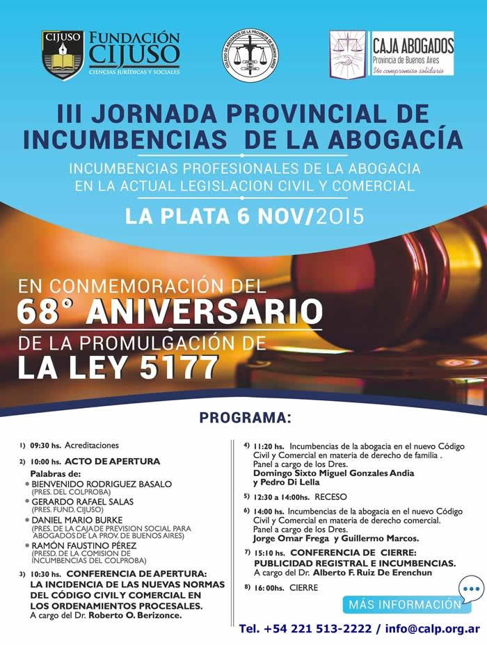 Te invitamos a participar de la “III JORNADA PROVINCIAL DE INCUMBENCIAS DE LA ABOGACÍA”, realizada conjuntamente entre la Fundación CIJUSO, COLPROBA y la Caja de Abogados de la Provincia de Aires,que se realizará el día 6 de noviembre en el Salón Auditorio del Colegio de Abogados de La Plata, ubicado en la Av. 13 Nº 821/, La Plata.