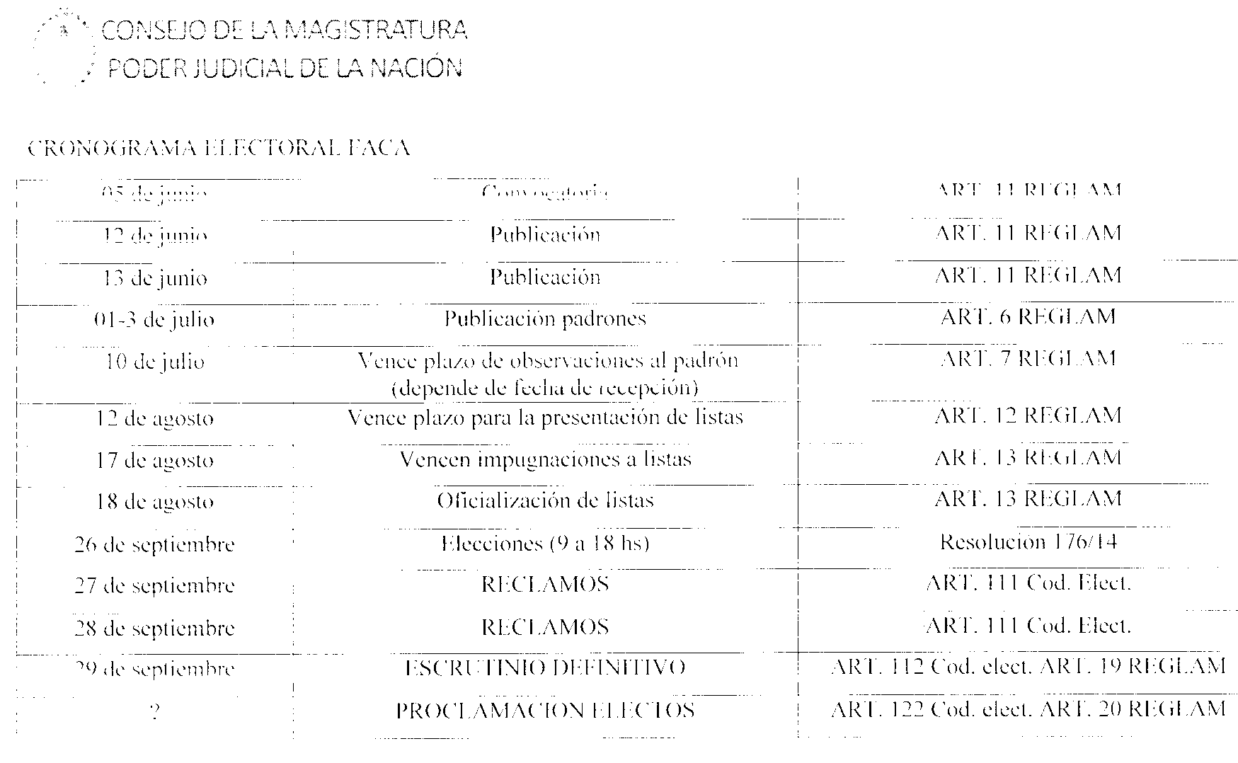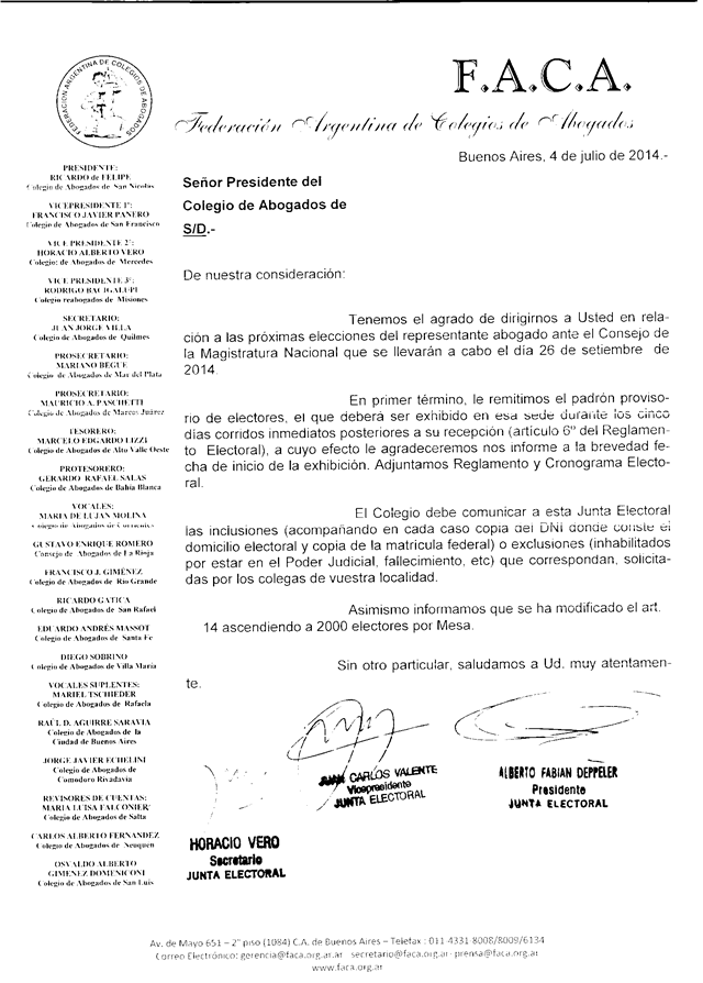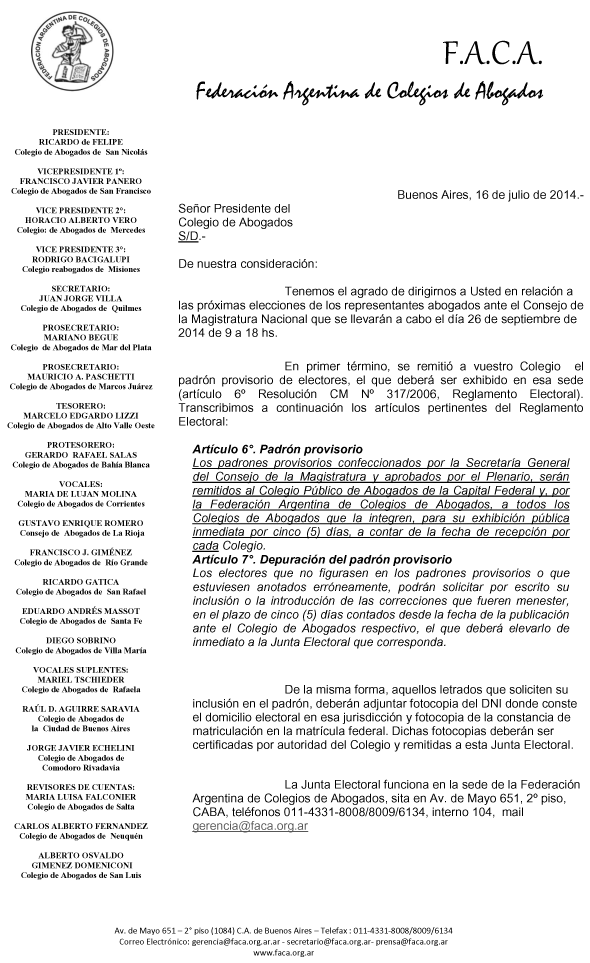 Tenemos el agrado de dirigirnos a Usted en relación a las próximas elecciones de los representantes abogados ante el Consejo de la Magistratura Nacional que se llevarán a cabo el día 26 de septiembre de 2014 de 9 a 18 hs.