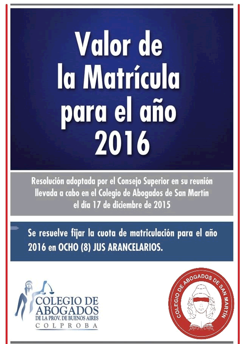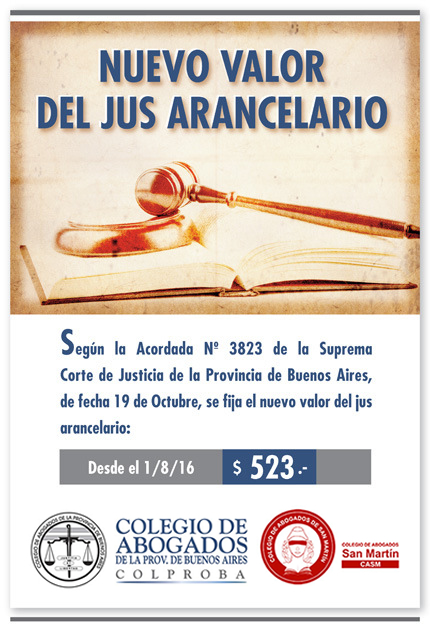 El CASM informa a sus matriculados que la Suprema Corte de Justicia de la Provincia de Buenos Aires, mediante la Acordada 3823 de fecha 19 de octubre de 2016 ha fijado el valor del "JUS", con vigencia desde el 1º de agosto de 2016, en la suma de pesos quinientos veintitrés ($ 523).