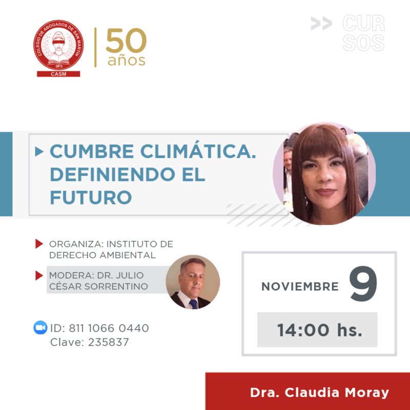 Disertante: Dra. Claudia Moray. Directora del Instituto de Derecho Ambiental CASM. Directora general el nodo Argentina del CEA -Comité Euroamericano de Derecho Digital-.Directora de Relaciones Internacionales en AAJC -Asociación Argentina de Justicia Constitucional-. Magister MBA. Docente universitaria. Autora.