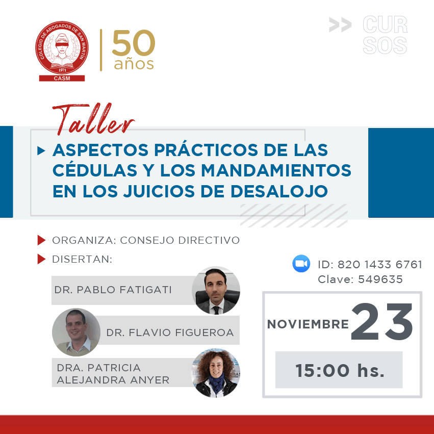 Disertantes: -Dr. Pablo Fatigati -Dr. Flavio Figueroa -Dra. Patricia Alejandra Anyer Abogados jefes de las oficinas de mandamientos y notificaciones de San Martín, Malvinas Argentinas y San Miguel