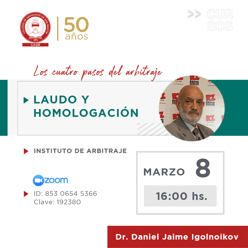 Disertante: Dr. Daniel Jaime Igolnoikov Docente de posgrado, UBA e Instituto Argentino de Negociación, Conciliación y Arbitraje (IANCA), entidad formadora registrada en el Ministerio de Justicia y DDHH de la Nación. Autor Esta actividad otorgará 3 puntos para los aspirantes a integrar el Tribunal Arbitral del Colegio.