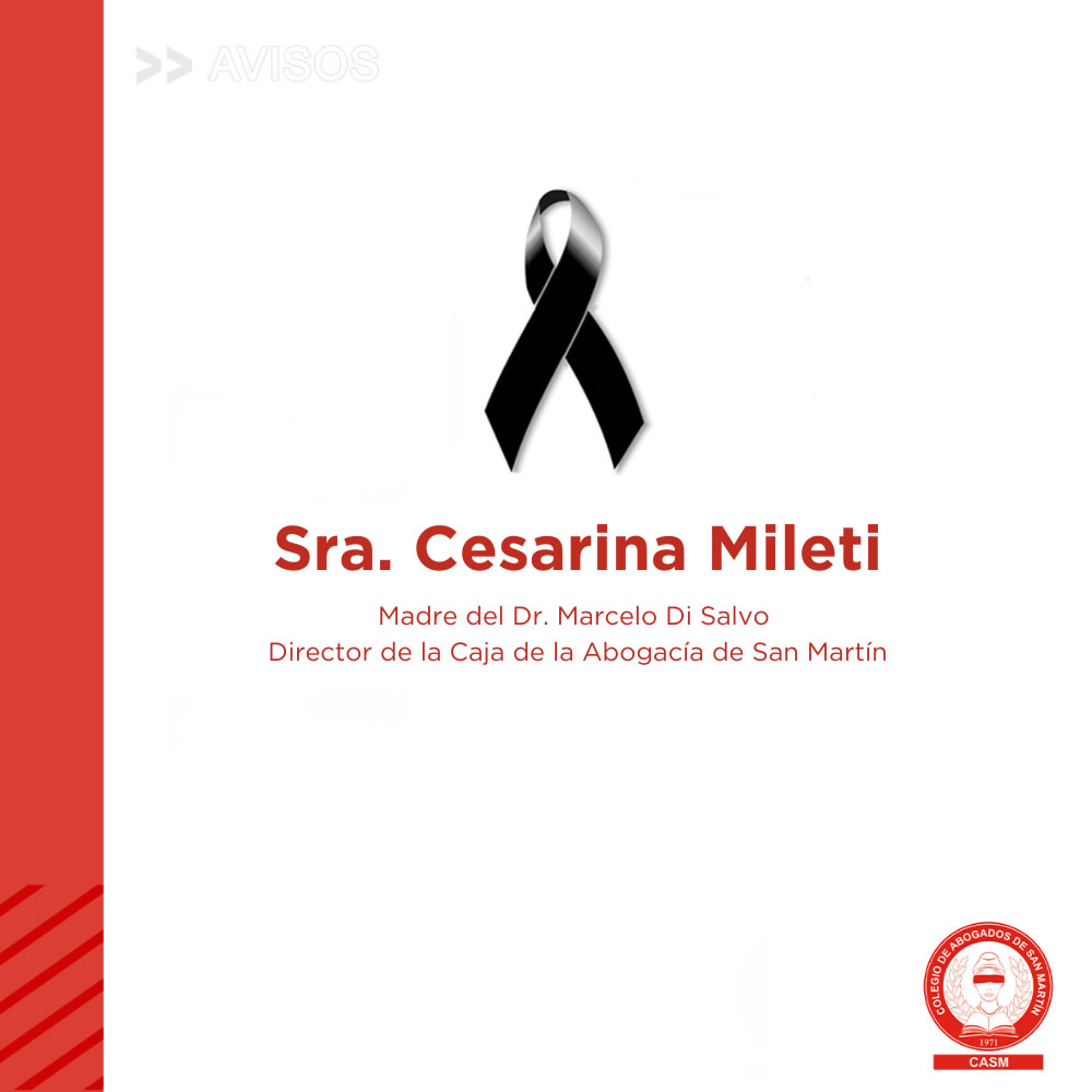 Con profundo pesar, comunicamos el fallecimiento de la Sra. Cesarina Mileti , quien era la madre del Dr. Marcelo Di Salvo, director de la Caja de la Abogacía de San Martín