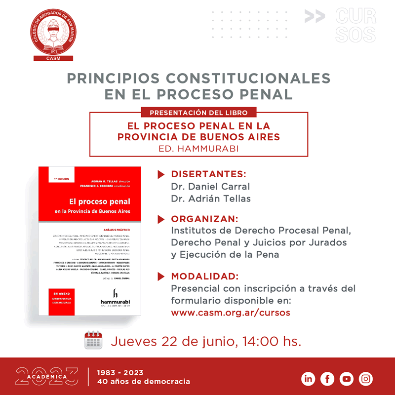 Temas a tratar: presentación del libro "El proceso penal en la provincia de Buenos Aires", Editorial Hammurabi, dirección del Dr. Adrián R. Tellas y coordinación del Dr. Francisco Crocioni.