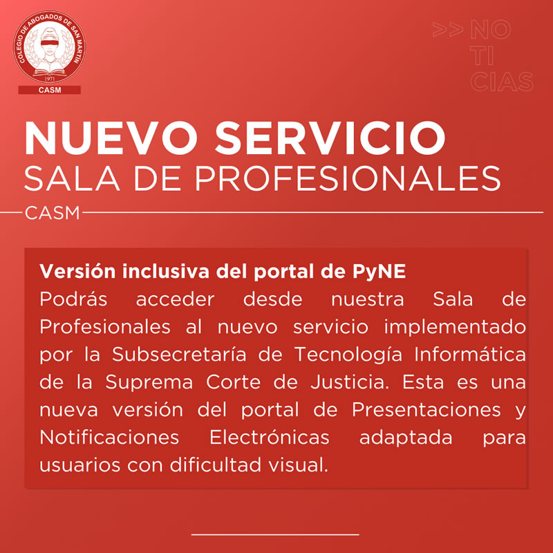 Podrás acceder desde nuestra Sala de Profesionales al nuevo servicio implementado por la Subsecretaría de Tecnología Informática de la Suprema Corte de Justicia. Esta es una nueva versión del portal de Presentaciones y Notificaciones Electrónicas adaptada para usuarios con dificultad visual.