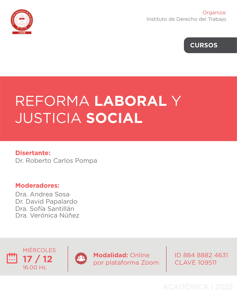 Disertante: Dr. Roberto Carlos Pompa Abogado especializado en derecho constitucional social. Magister en Empleo, relaciones laborales y diálogo social. Juez de la Cámara Nacional de Apelaciones del Trabajo de la República Argentina. Presidente de la Asociación Latinoamericana de Jueces del Trabajo. Docente UBA. Autor